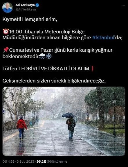 İstanbul Valisi Ali Yerlikaya, hafta sonu beklenen hava muhalefeti nedeniyle İstanbullulara uyarıda bulundu. Yerlikaya, Twitter hesabından yaptığı paylaşımda, kentteki hava durumuna dair tahminlere yer vererek, "Kıymetli hemşehrilerim, 16.00 itibarıyla Meteoroloji Bölge Müdürlüğümüzden alınan bilgilere göre İstanbul'da cumartesi ve pazar günü karla karışık yağmur beklenmektedir. Lütfen tedbirli ve dikkatli olalım. Gelişmelerden sizleri sürekli bilgilendireceğiz." ifadelerini kullandı.