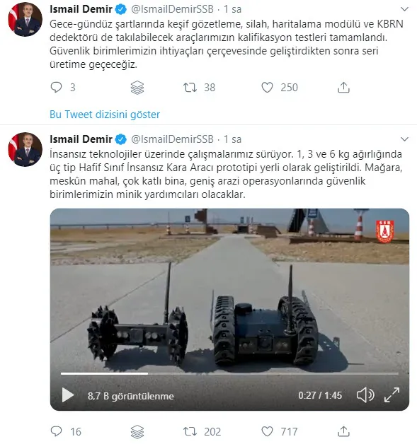 Cumhurbaşkanlığı Savunma Sanayii Başkanı İsmail Demir, sosyal medya hesabından paylaştığı videoda Hafif Sınıf İnsansız Kara Aracı prototipleriyle ilgili bilgi paylaştı.