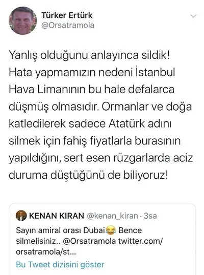 Türker Ertürk, söz konusu paylaşımın gerçek dışı olduğunun ortaya çıkmasının ardından sildi ve "Yanlış olduğunu anlayınca sildik! Hata yapmamızın nedeni İstanbul Hava Limanının bu hale defalarca düşmüş olmasıdır. Ormanlar ve doğa katledilerek sadece Atatürk adını silmek için fahiş fiyatlarla burasının yapıldığını, sert esen rüzgarlarda aciz duruma düştüğünü de biliyoruz!" ifadelerinin yer alan tweet paylaştı.
