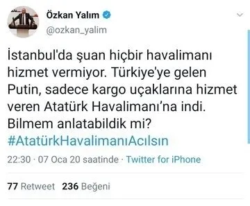 CHP Uşak Milletvekili ve AB Uyum Komisyonu Başkanvekili Özkan Yalım: "İstanbul'da şuan hiçbir havalimanı hizmet vermiyor. Türkiye'ye gelen Putin, sadece kargo uçaklarına hizmet veren Atatürk Havalimanı'na indi. Bilmem anlatabildik mi? #AtatürkHavalimanıAcılsın"