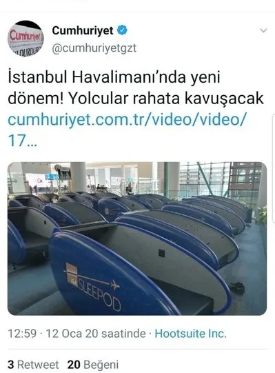 Cumhuriyet Gazetesi de, İstanbul Havalimanı'nda yolcular için başlatılan yeni hizmeti 'yanlışlıkla' övdüğü haberin paylaşımını Twitter'dan önce paylaştı, sonra sildi.