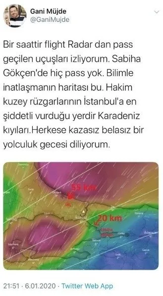 Yönetmen Gani Müjde de, sosyal paylaşım sitesi Twitter'daki şahsi hesabından, "Bir saattir flight radardan pass geçilen uçuşları izliyorum. Sabiha Gökçen'de hiç pass yok. Bilimle inatlaşmanın haritası bu. Hakim kuzey rüzgarlarının İstanbul'a en şiddetli vurduğu yerdir Karadeniz kıyıları. Herkese kazasız belasız bir yolculuk gecesi diliyorum" iddiasında bulundu.