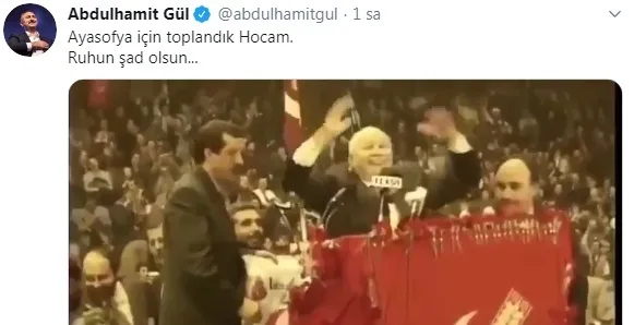 Danıştay'ın Ayasofya kararının ardından Milli Görüş Hareketi'nin kurucusu merhum Prof. Dr. Necmettin Erbakan'ın sözleri gündeme geldi. Erbakan, bir konuşmasının ardından halkı "Ayasofya içinde toplanmak üzere. Allah'a emanet olun." diyerek selamlamıştı.