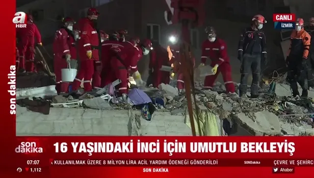 Son dakika haberine göre: İzmir'de arama kurtarma çalışmaları devam ederken, "Orada kimse var mı?" sorusuna bir apartmanda 16 yaşındaki İnci "buradayım" yanıtını verdi. Arama kurtarma ekipleri 16 yaşındaki İnci'yi kurtarmak için çalışmalara başladı. Gelen son dakika haberine göre 16 yaşındaki İnci, yaralı olarak çıkarıldı.