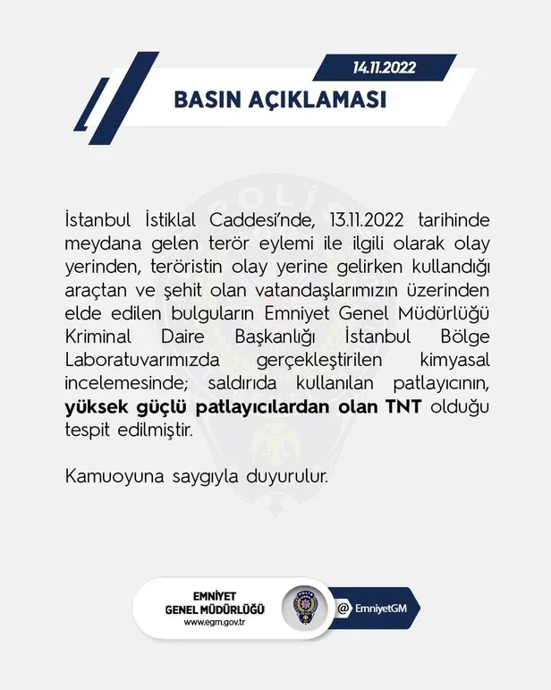 EGM Kriminal Daire Başkanlığı'nın Twitter'daki hesabından yapılan açıklamada, "İstanbul İstiklal Caddesi'nde, 13 Kasım 2022 tarihinde meydana gelen terör eylemi ile ilgili olarak olay yerinden, teröristin olay yerine gelirken kullandığı araçtan ve şehit olan vatandaşlarımızın üzerinden elde edilen bulguların Emniyet Genel Müdürlüğü Kriminal Daire Başkanlığı İstanbul Bölge Laboratuvarı'mızda gerçekleştirilen kimyasal incelemesinde; saldırıda kullanılan patlayıcının, yüksek güçlü patlayıcılardan olan TNT olduğu tespit edilmiştir" denildi.