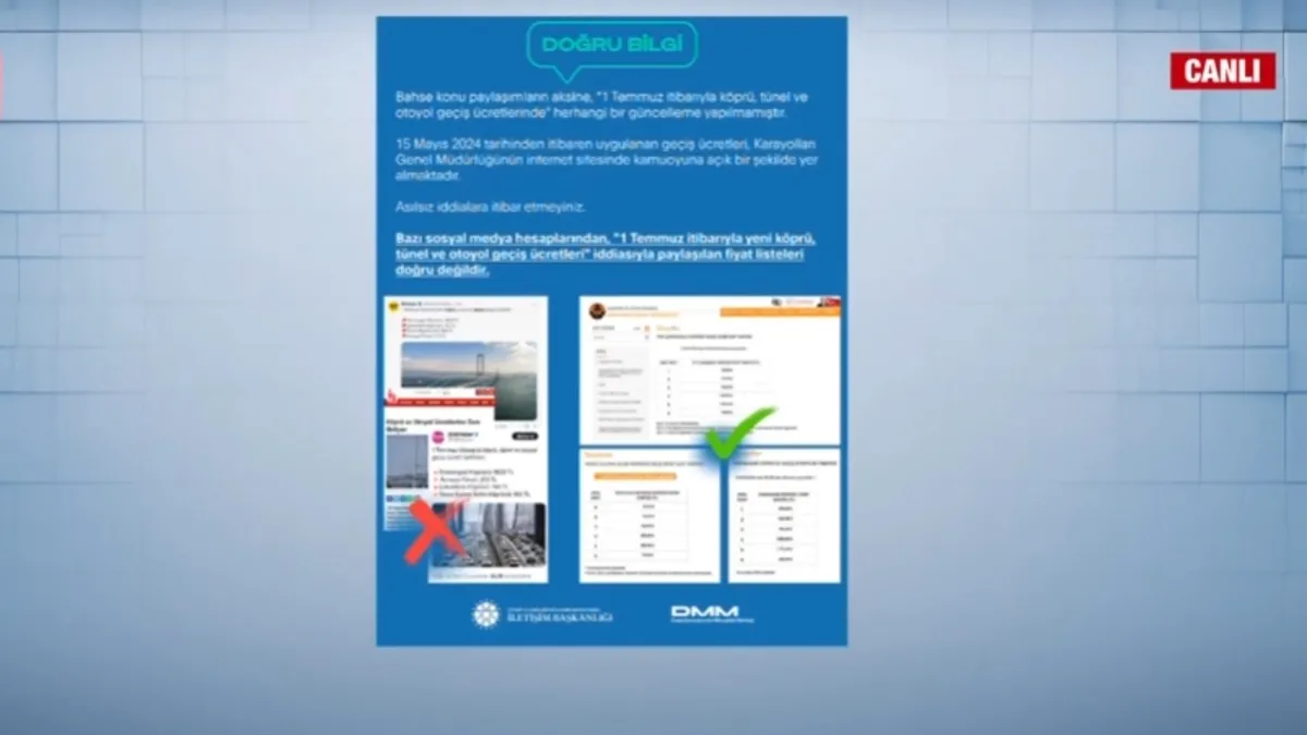 1 Temmuz'dan itibaren köprü ve otoyol ücretlerine zam geleceği iddiaları sonrasından resmi açıklama yapıldı. İddia Dezenformasyonla Mücadele Merkezi tarafından yalanlandı. Yapılan açıklamada; "Bahse konu paylaşımların aksine, "1 Temmuz itibarıyla köprü, tünel ve otoyol geçiş ücretlerinde" herhangi bir güncelleme yapılmamıştır." denildi.