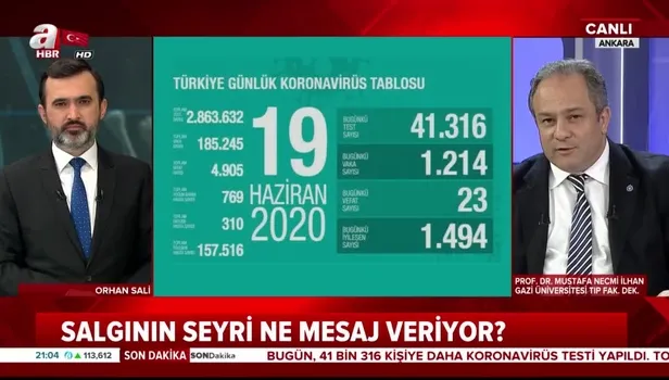 A Haber canlı yayınında 19 Haziran Cuma gününe ait verileri değerlendiren Prof. Dr. Mustafa Necmi İlhan vaka sayılarının kurallara uyulursa önümüzdeki hafta perşembe-cuma gününe doğru binin altına ineceğini söyledi.