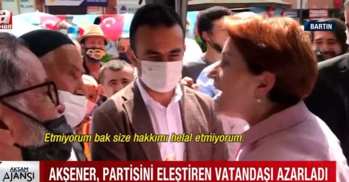 Gittiği her ilde vatandaşın tepkilerine maruz kalan İYİ Parti Genel Başkanı Meral Akşener, Bartın’ın Kumluca beldesinde gerçekleştirdiği esnaf ziyaretleri sırasında bir vatandaşın, “Sen Kılıçdaroğlu ile kol kola giriyorsun” sözleriyle karşılaştı. Vatandaşa tepki gösteren Akşener Kılıçdaroğlu ile kol kola girmediği iddia ederek "Hakkım haram olsun hepinize" sözleriyle vatandaşları adeta azarladı.