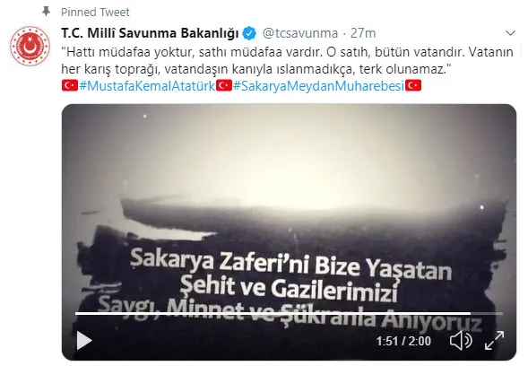Milli Savunma Bakanlığı, İstiklal Mücadelesinin dönüm noktalarından biri olan ve 22 gün süren çatışmaların ardından zaferle sonuçlanan Sakarya Meydan Muharebesi'nin 98'inci yıl dönümüne özel bir video hazırladı. Video, Mustafa Kemal Atatürk'ün, 'Hattı müdafaa yoktur, sathı müdafaa vardır. O satıh, bütün vatandır. Vatanın her karış toprağı, vatandaşın kanıyla ıslanmadıkça, terk olunamaz' sözleriyle bakanlığın Twitter hesabından paylaşıldı. Videoda, Atatürk'ün görüntülerine ve muhabereye ilişkin sözlerine de yer verildi. Video, 'Sakarya Zaferi'ni bize yaşatan şehit ve gazilerimizi saygı, minnet ve şükranla anıyoruz' sözleri ile sona erdi.