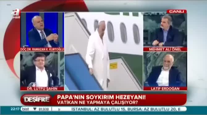 A Haber'de yayınlanan Deşifre programında Papa'nın soykırım hezeyanı masaya yatırıldı. Programın konuklarından Doç.Dr.Kağan Kurtoğlu yaptığı açıklamada Papa'nın İslam üzerinden ırkçılık yaptığını söyledi.