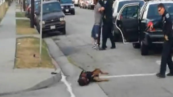 ABD'nin California eyaletinde yürek burkan bir olay yaşandı. Gözaltına alınan sahibini korumak isteyen bir köpek, polis tarafından defalarca ateş edilerek öldürüldü. Yaşananlar saniye saniye kameraya yansıdı.