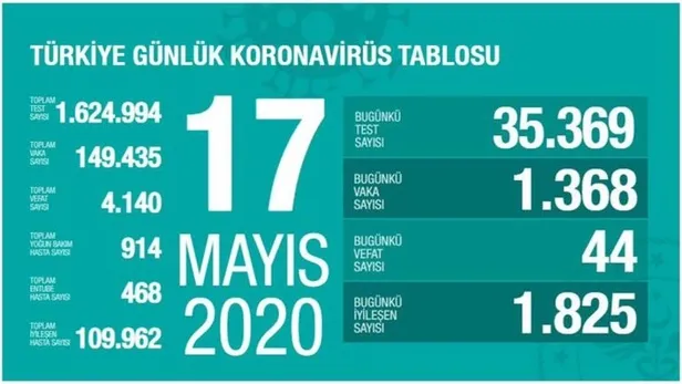 44 kişi vefat ederken, 1825 kişi de iyileşti. Bugünkü verilerle, toplam test sayısı 1 milyon 624 bin 994, toplam vaka sayısı 149 bin 435, toplam vefat sayısı 4 bin 140, toplam yoğun bakım hasta sayısı 914, toplam entübe hasta sayısı 468, toplam iyileşen hasta sayısı ise 109 bin 962 oldu.