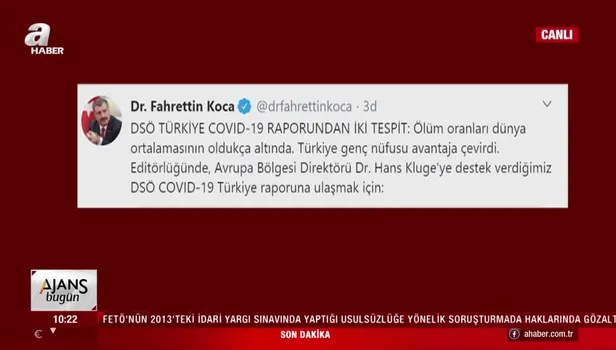 Son dakika haberi... Sağlık Bakanı Fahrettin Koca: DSÖ, Türkiye’nin COVID-19’la mücadelesi konusunda, Avrupa bölgesinde ilk olma özelliği taşıyan bir rapor yayınladı. Raporda, kararlılıkla uygulanan tedbirler ve çok sektörlü yaklaşım sonucu ulaşılan başarı ele alınıyor. Rapora göre, Türkiye, uygulamalarıyla birçok ülkeye örnek.