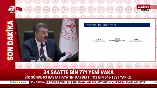 3 büyük şehir hakkında önemli açıklamalarda bulunan Bakan Koca, "Ankara yatak doluluk oranı yüzde 52,9. Yoğun bakım yüzde 64,8, ventilatör yüzde 28,1. Günlük ortalama zatürre vaka oranı yüzde 6,02. Zatürre oranı bizim için son derece önemli, erken tedaviyle zatürrenin azaldığını, tedavi etmekte başarılı olduğumuzu gösteren bir tablo. Son hafta günlük ortalama vaka sayısı son ay vaka sayısına göre artış oranı yüzde 38, 84. Son hafta günlük ortalama vaka sayısı son ay vaka sayısına göre artış oranı yüzde 38, 84" şeklinde konuştu.