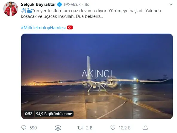 Baykar Teknik Müdürü Selçuk Bayraktar, Akıncı Taarruzi İnsansız Hava Aracı'nın yer testi görüntüsünü paylaştı. Bayraktar, sosyal medya hesabı üzerinden ekibiyle çalıştığı anların görüntüsünü, "Yer testleri tam gaz devam ediyor. Yürümeye başladı. Yakında koşacak ve uçacak inşallah. Dua bekleriz" notu ile paylaştı.