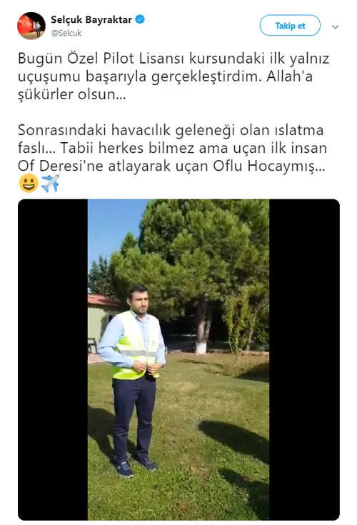 Baykar Makine'nin teknik müdürü olarak görev yapan ve Türkiye'nin terörle mücadelesinde büyük önem arz eden SİHA'ları geliştiren Selçuk Bayraktar, Özel Pilot Lisansı kursundaki ilk yalnız uçuşunu gerçekleştirdi. Bayraktar uçuş sonrası havacılık geleneği olan ıslatma faslına tabi tutulurken eğlenceli görüntüler ortaya çıktı.