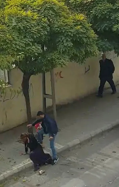 Gaziantep'te bir erkeğin, eşi olduğu tahmin edilen kadını çocuğunun yanında sokak ortasında tekme tokat darp ettiği anlar kameraya yansıdı.