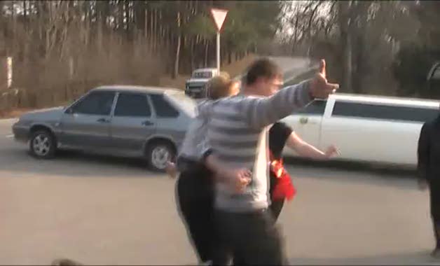Rusya'da bir sokak düğününde insanlar dans ederken bir otomobil sürücüsü direksiyon hakimiyetini kaybedip, düğünün yapıldığı caddedeki bir araca çarptı.