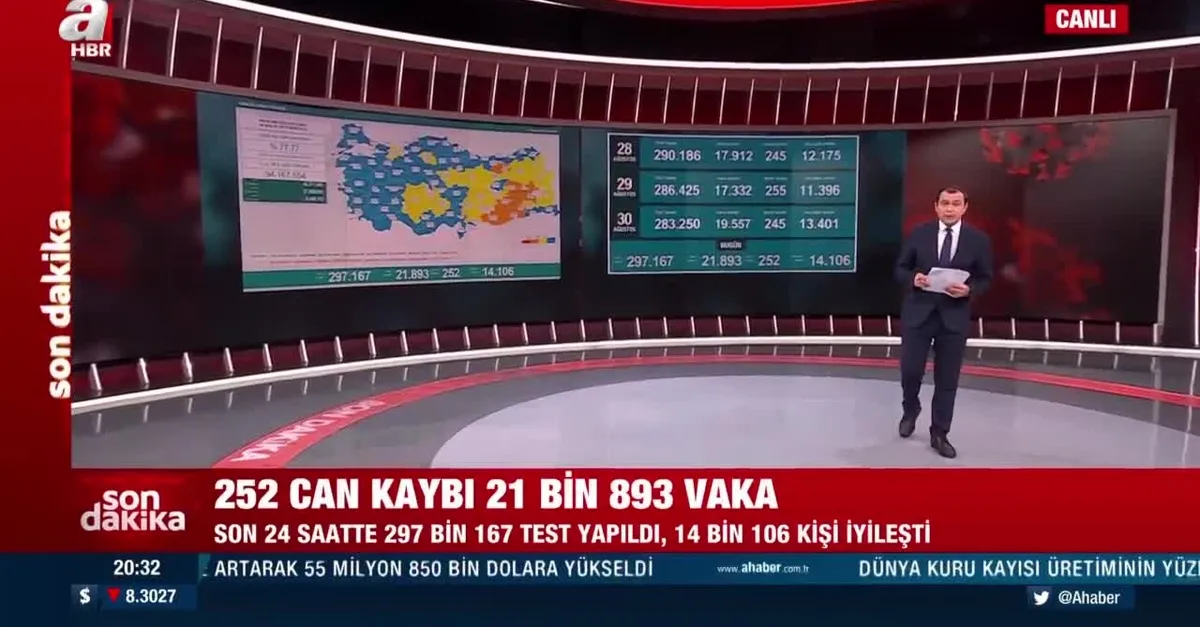 Sağlık Bakanı Fahrettin Koca 31 Ağustos 2021 koronavirüs vaka, vefat ve aşı sayılarını içeren son Kovid-19 tablosunu paylaştı. Son 24 saatte 297 bin 167 Kovid-19 testi yapıldı, 21 bin 893 kişinin testi pozitif çıktı, 252 kişi hayatını kaybetti.