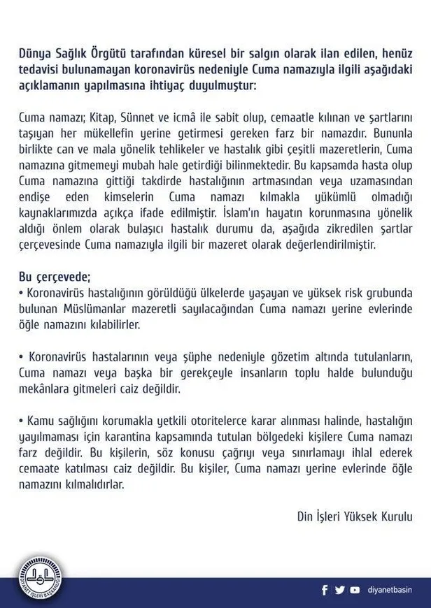 Din İşleri Yüksek Kurulu'ndan yapılan açıklamada "Koronavirüs hastalığının görüldüğü ülkelerde yaşayan ve yüksek risk grubunda bulunan Müslümanlar mazeretli sayılacağından, Cuma Namazı yerine evlerinde öğle namazını kılabilirler. Kamu sağlığını korumakla yetkili otoritelerce karar alınması halinde, hastalığın yayılmaması için karantina kapsamında tutulan bölgedeki kişilere Cuma namazı farz değildir. Bu kişilerin, söz konusu çağrıyı veya sınırlamayı ihlal ederek cemaate katılması caiz değildir." ifadelerine yer verildi.