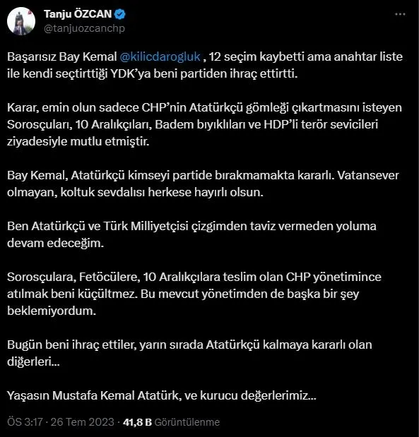 "Yüksek Disiplin Kurulu'nun 26.07.2023 tarihli toplantısında, Tanju Özcan hakkında CHP Tüzüğünün 68. Maddesi 1- a) ve 1- b) fıkraları uyarınca KESİN ÇIKARMA CEZASI verilmiştir."