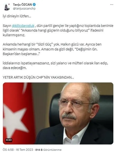 "İyi dinleyin lütfen" başlığıyla yayınladığı videoda kendisiyle ilgili "Partiden atın gitsin bu adamı ne işi var" ifadelerinin kullanıldığı ses kaydına Özcan, "Sayın Kılıçdaroğlu dün partili gençler ile yaptığınız toplantıda benimle ilgili olarak 'Arkasında hangi güçlerin olduğunu biliyoruz' ifadesini kullanmışsınız. Arkamda herhangi bir 'Gizli güç' yok. Halkın gücü var." dedi.