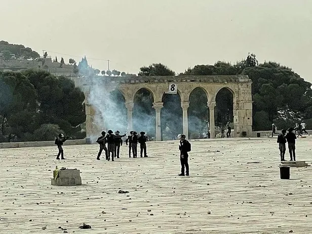 Daha sonra Mescid-i Aksa'ya baskın düzenleyen İsrail polisi, Filistinlilere göz yaşartıcı gaz, plastik mermi ve ses bombalarıyla müdahale etti.