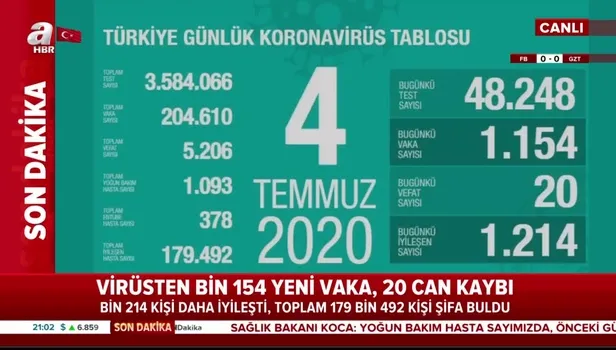 Son dakika haberine göre, Sağlık Bakanı Fahrettin Koca Twitter üzerinden 4 Temmuz yeni tip koronavirüs vaka, iyileşen ve vefat sayılarını içeren tabloyu paylaştı. Son 24 saatte 1154 kişiye Kovid-19 tanısı konuldu, 20 kişi hayatını kaybetti, toplam vaka sayısı 204 bin 610, can kaybı 5 bin 206 oldu. Son 24 saatte 1214 kişinin daha iyileşmesiyle Kovid-19 tedavisi tamamlananların sayısı 179 bin 492 oldu.
