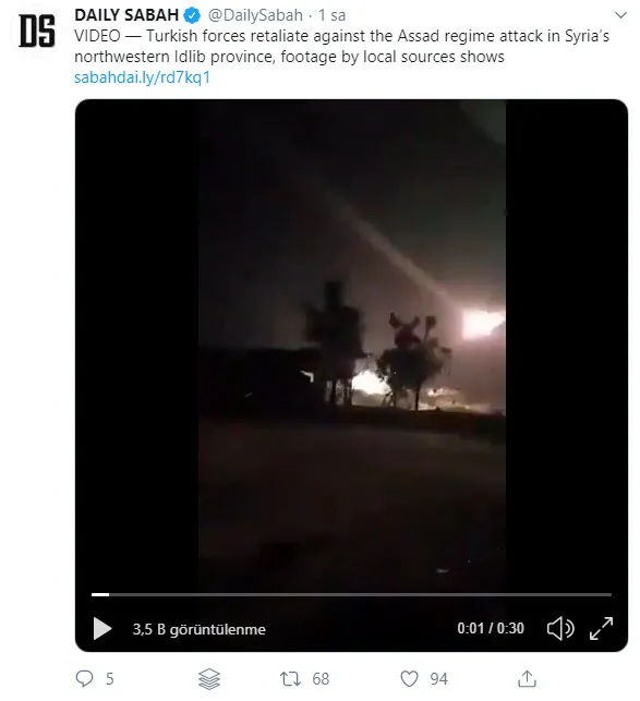 Son dakika haberine göre Türk Silahlı Kuvvetleri, Suriye'nin İdlib eyaletinde Esed rejimi tarafından yapılan saldırıya anında cevap verdi. Cumhurbaşkanlığı Sözcüsü İbrahim Kalın, saldırı sonrası yaptığı açıklamada "İdlib mutabakatı hilafına yapılan bu saldırıya derhal karşılık verilmiştir." ifadelerini kullanmıştı. İşte misilleme anının görüntüleri...