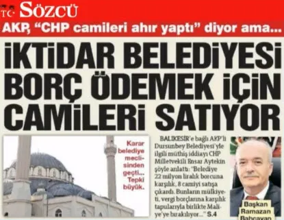 Sözcü ve Cumhuriyet gazetesi ile Odatv internet sitesi, AK Partili belediyelerin borç ödemek için camileri satılığa çıkardığı yönündeki haberleriyle büyük algı operasyonuna imza attı. Dursunbey Belediye Başkanı Ramazan Bahçavan, A Haber canlı yayınına bağlanarak, cami devrini siyasi malzeme yapan CHP yandaşı medyanın yalanlarını bir bir deşifre etti. Ramazan Bahçavan, "Dursunbey Belediyesi'nin Maliye'ye borcu yok." dedi.