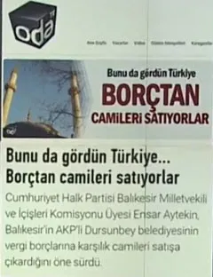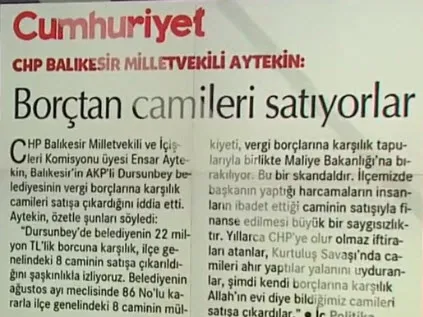 Cumhuriyet Halk Partisi Balıkesir Milletvekili ve İçişleri Komisyonu Üyesi Ensar Aytekin, Balıkesir'in AK Partili Dursunbey belediyesinin vergi borçlarına karşılık camileri satışa çıkardığını öne sürdü.