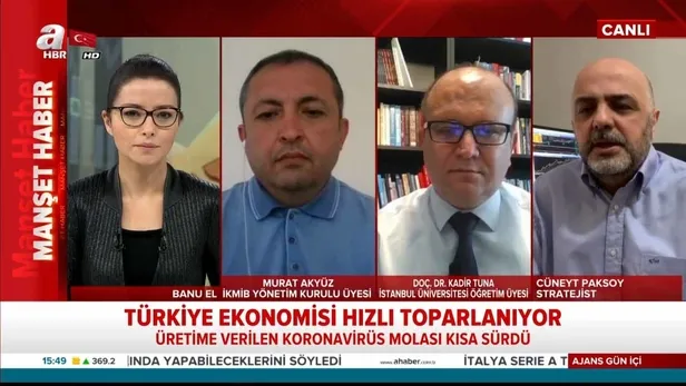 Üretime verilen koronavirüs molası kısa sürdü, Türkiye ekonomisi hızlı bir toparlanma sürecinin içine girdi. Sanayi merkezlerinde fabrikalar vardiya sistemine döndü. A Haber canlı yayınına katılan İKMİB Yönetim Kurulu Üyesi Murat Akyüz, İstanbul Üniversitesi Öğretim Üyesi Doç. Dr. Kadir Tuna ve Stratejist Cüneyt Paksoy, Türkiye ekonomisinin koronavirüsle mücadele sürecindeki performansını ve toparlanma sürecini değerlendirdi.
