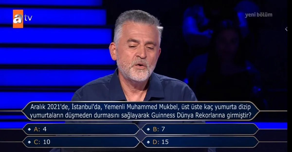 Kim Milyoner Olmak İster'in yeni bölümü yine izleyicisini ekranları başına kilitledi. Kenan İmirzalıoğlu'nun sunduğu yarışmada bir yarışmacıya sorulan ‘’Aralık 2021’de, İstanbul’da, Yemenli Muhammed Mukbel, üst üste kaç yumurta dizip yumurtaların düşmeden durmasını sağlayarak Guinness Dünya Rekorlarına girmiştir’’ sorusu geceye damga vurdu. İşte soru ve cevabı…
