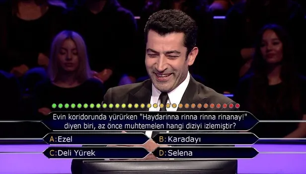 ATV ekranlarının heyecanla takip edilen yarışma programı Kim Milyoner Olmak İster bu akşam yeni bölümüyle izleyicisiyle buluştu. Dünyanın ve Türkiye'nin en çok kazandıran yarışma programında yarışmacıya "Evin koridorunda yürürken "Haydarinna rinna rinna rinanay" diyen biri, az önce muhtemelen hangi diziyi izlemiştir?" sorusu yöneltildi. Deli Yürek dizisinde Yusuf Miroğlu karakterine hayat veren programın sunucusu Kenan İmirzalığlu bu soru karşısında gülümsedi. İşte o anlar...
