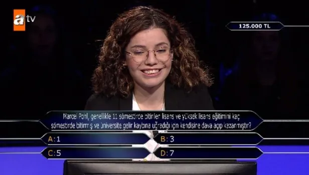 ATV'nin ilgiyle takip edilen yarışma programı Kim Milyoner Olmak İster'e Marcel Pohl sorusu damga vurdu. Marcel Pohl 11 sömestirde bitirilen lisans ve yüksek lisans eğitimini kaç sömestirde bitirmiş ve üniversite gelir kaybına uğradığı için kendisine dava açıp kazanmıştır sorusu bu akşam Kim Milyoner Olmak İster'de yarışmacıya soruldu. İşte o soru, şıkları ve cevabı