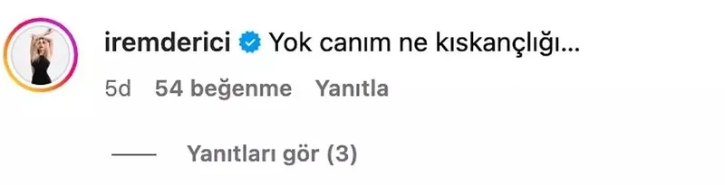 İrem Derici gelen yorumlara ise "Yok canım ne kıskançlığı..." diyerek cevap verdi.