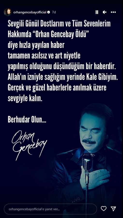Batsın Bu Dünya, Hatasız Kul Olmaz, Bir Teselli Ver ve daha nicesiyle gönüllere taht kuran Orhan Gencebay, kariyerinin yanı sıra vatan sevgisiyle de sık sık adından söz ettirdi. Cumhuriyetin 100. yılına armağanı "Canım Türkiye'm" parçasıyla da beğeni toplayan Gencebay, son olarak kahreden bir iddiayla gündeme geldi. Bazı sosyal medya kullanıcıları, Orhan Gencebay'ın vefat ettiğini iddia etti. Bunun üzerine "Orhan Gencebay öldü mü?" sorusunun yanıtı aratıldı. Konuya ilişkin yapılan ilk açıklamada iddia yalanlanırken Orhan Gencebay da sessizliğini bozu.