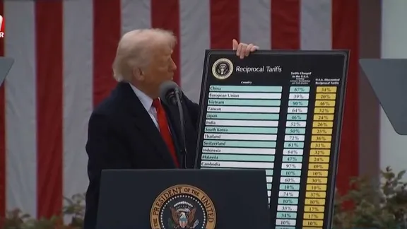 ABD Başkanı Donald Trump, günlerdir beklenen konuşmasında çok sayıda ülkeye yönelik gümrük vergileri açıkladı. Trump, kürsüye elinde bir tabloyla çıkarken, uygulanacak vergilerle ilgili detaylı bilgi vererek; Çin'den ithal edilen ürünlere yüzde 34, Avrupa Birliği'nden ithal edilen ürünlere ise yüzde 20 gümrük vergisi getirildiğini duyurdu.