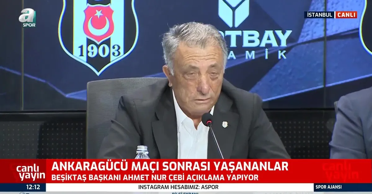 Beşiktaş Başkanı Ahmet Nur Çebi, sponsorluk anlaşmasında çarpıcı açıklamalarda bulundu. Süper Spor Toto Lig'in 5. haftasında oynanan Ankaragücü maçındaki olaylara ve sonrasına değinen Çebi, Ankaragücü Teknik Direktörü Ömer Erdoğan için "Aklını başına alsın." ifadesini kullandı. İşte o sözler...