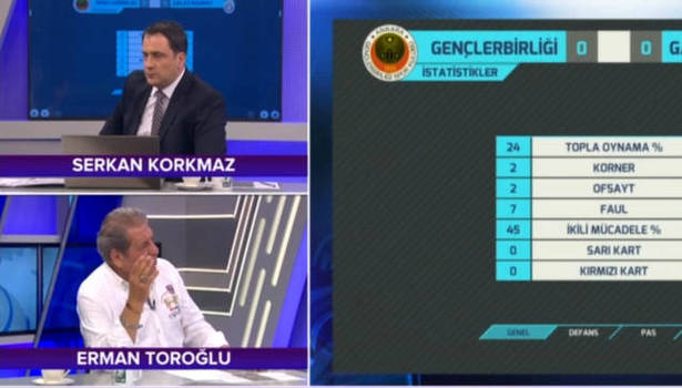 A Spor Yorumcusu Erman Toroğlu, ilk yarısı golsüz eşitlikle sona eren Gençlerbirliği-Galatasaray maçının devre arasında çarpıcı yorumlar yaptı. Terim'in yapabileceği hamleleri masaya yatıran Toroğlu, "Fatih Terim'in yerinde olsam oyuncu değişikliği yapacaksam Belhanda'yı çıkarmayı en son düşünürüm. Bu maç baskılı maç, bu tip maç sinir maçı. Belhanda biraz kaşar topçu. Kaşar topu lazım bu maçlarda. Penaltı yapar, bir şey yapar çok da amatör adamın maçı değil. Adam da attırabilir." diye konuştu.