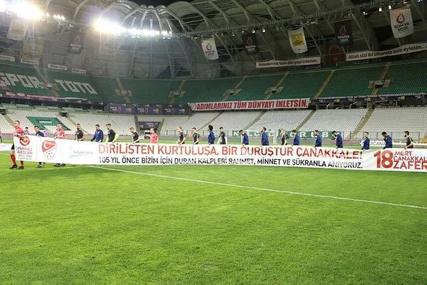 Konya Büyükşehir Belediye Stadı'ndaki maça futbolcular, "Dirilişten kurtuluşa bir duruştur Çanakkale. 105 yıl önce bizim için duran kalpleri rahmet, minnet ve şükranla anıyoruz" yazılı pankartla çıktı.