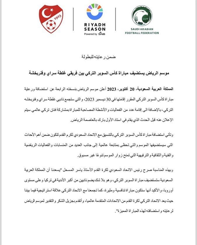 Fenerbahçe ile Galatasaray arasındaki dev finalin 30 Aralık'ta oynanacağı belirtildi. Öte yandan karşılaşma öncesi Türk bir sanatçının katılımıyla bir dizi etkinlikler düzenleneceği kaydedildi. TFF'den yapılan açıklamada, "2022-2023 Sezonu Süper Lig Şampiyonu Galatasaray ile Ziraat Türkiye Kupası Şampiyonu Fenerbahçe arasındaki 2023 Turkcell Süper Kupa maçı kulüplerimizin bilgisi dahilinde, 30 Aralık 2023 Cumartesi günü saat 20.00'de Suudi Arabistan'ın başkenti Riyad'da bulunan Al-Awwal Park (Kral Suud Üniversitesi) Stadyumu'nda oynanacaktır" denildi.