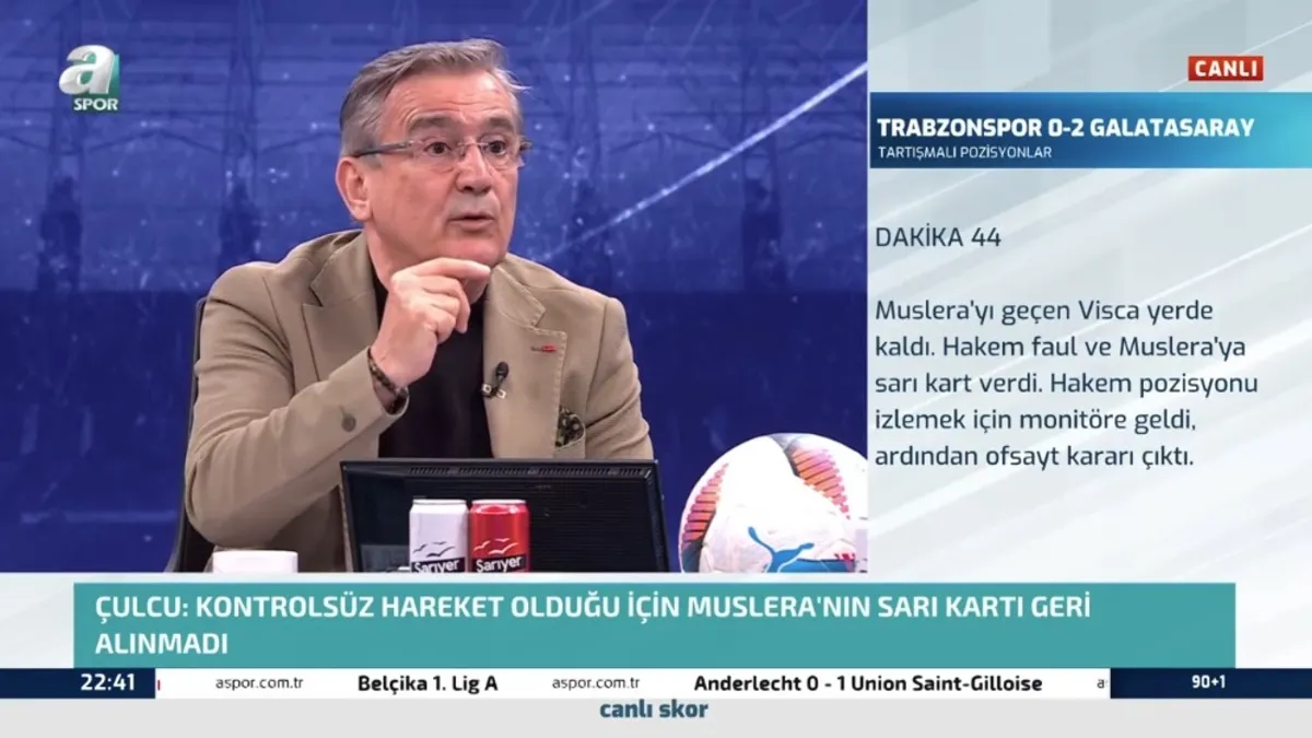 Galatasaray ile Trabzonspor’un karşı karşıya geldiği Trendyol Süper Lig’in kritik mücadelesinde, ilk yarının son anlarında Fernando Muslera ile Edin Visca arasında yaşanan pozisyon büyük tartışma yarattı. Ofsayt çizgisi çekilmeden ofsayt kararı veren hakem Atilla Karaoğlan’ın hamlesi uzun süre itirazlara sahne oldu. Penaltı beklentilerinin anlar, A Spor’un canlı yayınında gündem oldu. Eski MHK Başkanı Mustafa Çulcu ise pozisyonla ilgili çarpıcı yorumlarda bulundu.