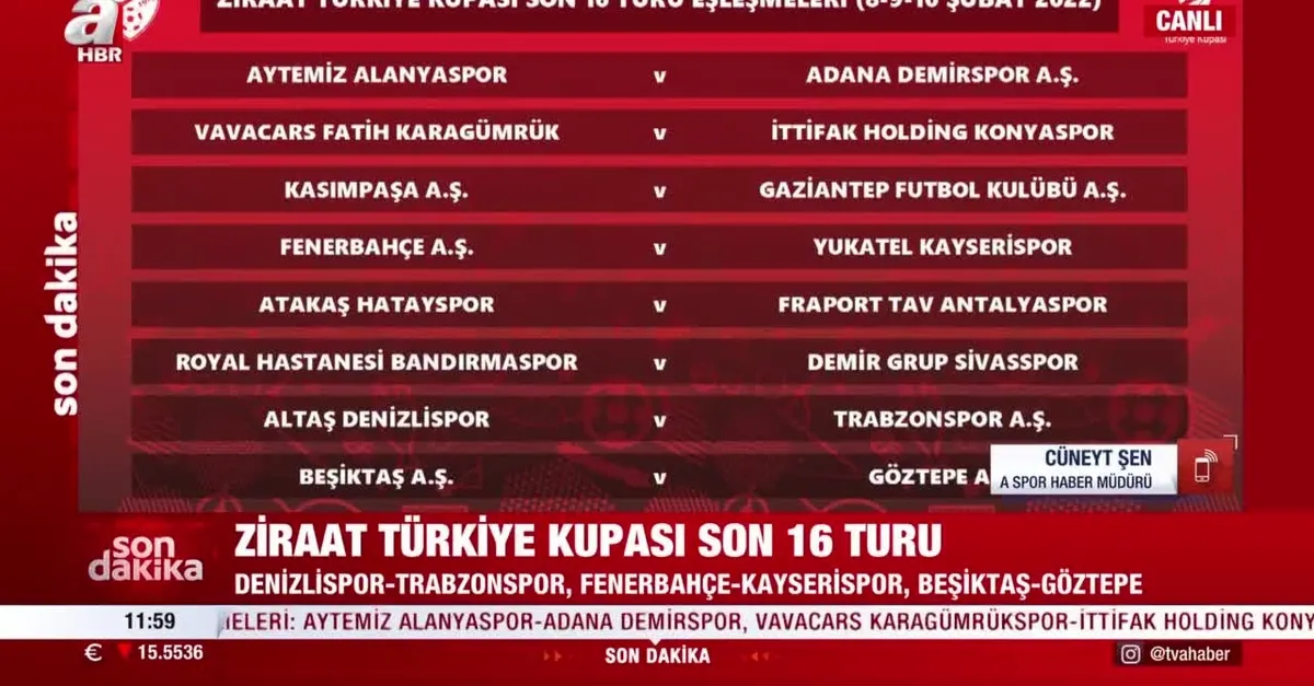Son dakika haberi... Turkuvaz Medya'nın futbolseverlerle buluşturduğu Ziraat Türkiye Kupası'nda son 16 turu kura heyecanı yaşandı. Süper Lig'de lider konumda bulunan Trabzonspor, sürpriz bir şekilde Galatasaray'ı kupa dışına iten Denizlispor ile eşleşti.