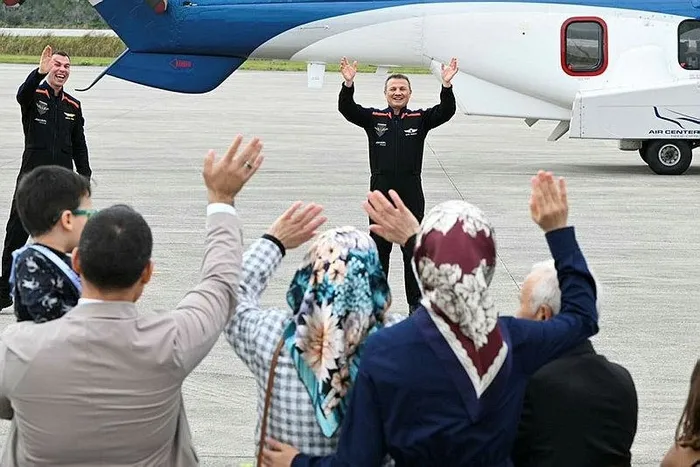 Alana helikopterle gelen Ax-3 mürettebatı, önce aileleriyle uzaktan selamlaştı, Gezeravcı da yumruklarını havaya kaldırarak iki eliyle ailesine selam verdi.