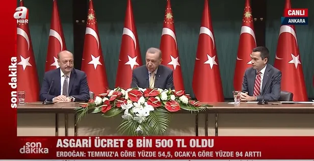 Asgari ücrete yüzde 54 artış yapılırken Erdoğan, "Ocak ayına göre yüzde 94 temmuz ayına göre yüzde 50 oranında artış sağlanmış" şeklinde konuştu.