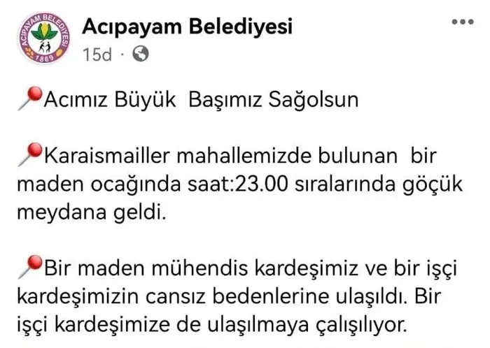 Denizli'nin Acıpayam ilçesine bağlı Karaismailler Mahallesi Devekonağı mevkiinde faaliyet gösteren krom madeninde 23.00 sıralarında göçük meydana geldi. Maden sahasında çalışan biri mühendis, 2'si işçi olmak üzere 3 kişi göçük altında kaldığı öğrenildi.