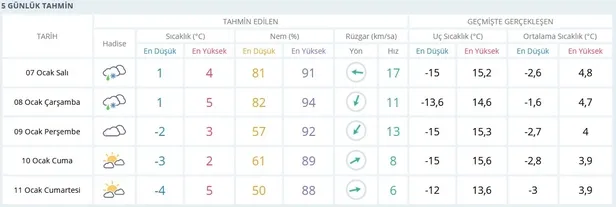 Gün içinde beklenen en yüksek sıcaklık ise Erzincan'da 5, Iğdır'da 3, Tunceli'de 2, Ardahan'da 1, Erzurum'da sıfır ve sıfırın altında olmak üzere Kars ve Ağrı'da 2 derece olacak.