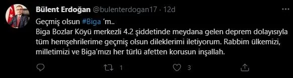 Biga Belediye Başkanı Bülent Erdoğan sosyal medya hesabından yaptığı açıklamada, 'Geçmiş olsun Biga 'm.. Biga Bozlar Köyü merkezli 4.2 şiddetinde meydana gelen deprem dolayısıyla tüm hemşehrilerime geçmiş olsun dileklerimi iletiyorum. Rabbim ülkemizi, milletimizi ve Biga'mızı her türlü afetten korusun inşallah.' dedi.