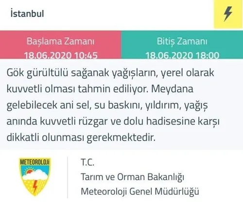İstanbul'da sabah saatlerinden itibaren şiddetli yağış etkili olmaya başladı. Saat 14.00 sıralarında Kartal'da bulunan Meteoroloji 1. Bölge Müdürlüğü binasının misafirhane bölümüne yıldırım düştü. İhbar üzerine bölgeye çok sayıda itfaiye ve sağlık ekibi sevk edildi. Yıldırım düşmesiyle birlikte Meteoroloji 1. Bölge Müdürlüğü bahçesinde bulunan yangın söndürme sensörleri devreye girdi.